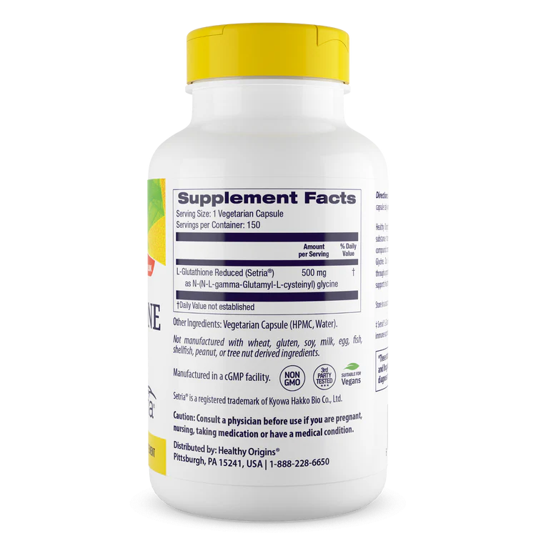 Directions: As a dietary supplement for adults; take one (1) capsule daily with a meal, or as directed by a physician. Healthy Origins® Setria® L-Glutathione Reduced is a naturally occurring substance that is a biologically active sulfur amino acid tripeptide compound containing three amino acids. L-Cysteine, L-Glutamic Acid, and Glycine. Our L-Glutathione Reduced is produced exclusively in Japan through a proprietary fermentation process.